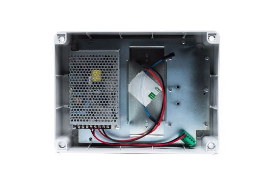 Robusto contenitore plastico contenente alimentatore 24 Vdc 2 A e uscita per l’alimentazione di 2 batterie tampone Pb-12V 2 Ah (opzionali).