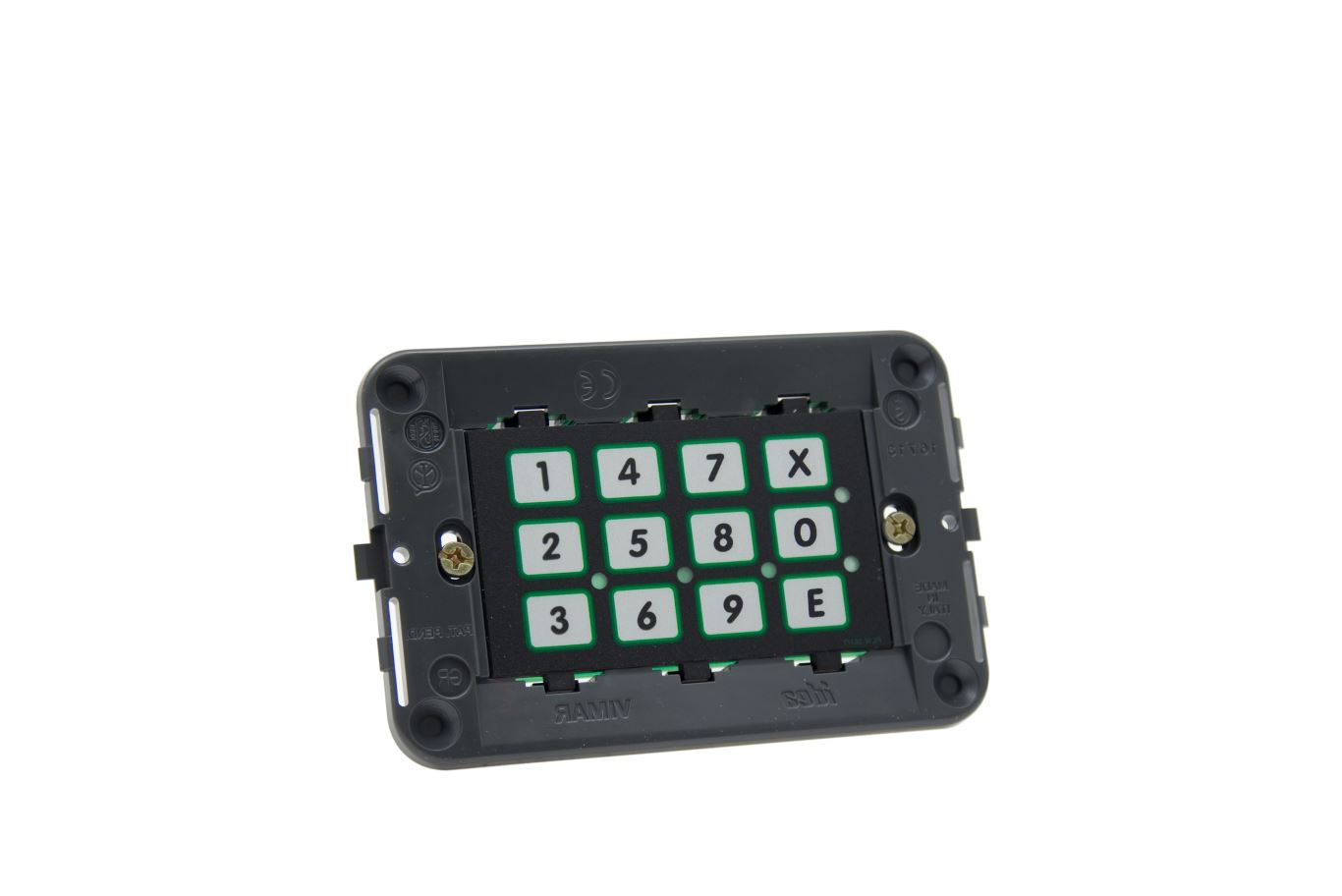 Tastiera digitale per qualsiasi applicazione di controllo accessi. Versione con meccanica in plastica su serie civile da interno con tastiera alfanumerica a 12 tasti in poliestere antigraffio e antisfondamento.
