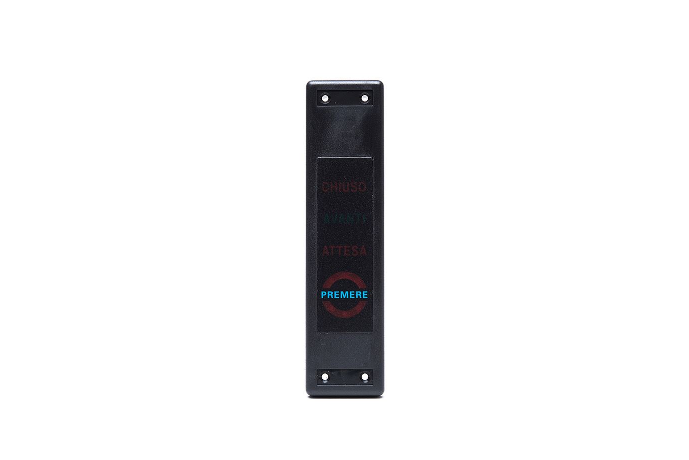 Dispone a bordo di 3 messaggi luminosi serigrafati su pannello di policarbonato antigraffio: “AVANTI”, “ATTESA” e “CHIUSO” ed illuminazione pulsante richiesta transito “PREMERE”.
