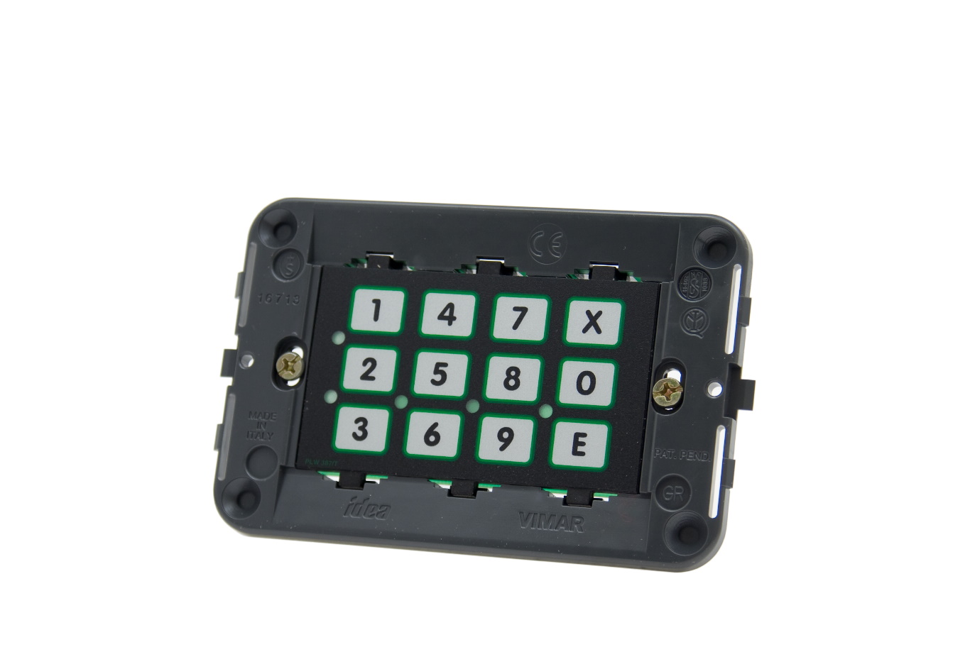 Chiave digitale su meccanica Vimar idea con pannello a 12 tasti in poliestere antigraffio da interno. Da completare con placca della serie Vimar idea. Permette l'attivazione di 2 relè tramite la digitazione di 120 codici numerici programmabili attraverso un codice master. È possibile creare una rete di massimo 16 chiavi digitali della linea PLY tramite 2 fili senza polarità utilizzando un unico modulo PLY PWR. È possibile utilizzare uno dei 120 codici a disposizione per le attivazioni come “Codice Notte” che inibisce la tastiera o la rete alla quale è collegata fino alla seconda digitazione del codice memorizzato. Possibilità di indirizzamento direttamente a bordo. 2 led di segnalazione e 2 led ausiliari liberi da potenziale abbinabili ai relè tramite jumper. Contatto tamper antimanomissione. Il contenitore plastico permette l’installazione ad incasso in scatole a muro 503.