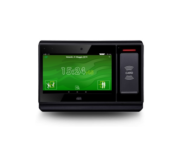 Il terminale è dotato di lettore di prossimità K5 125KHz e Mifare 1K 13,56MHz e tastiera numerica virtuale, che in caso di smarrimento della card possono consentire all’utente di timbrare manualmente tramite codice.