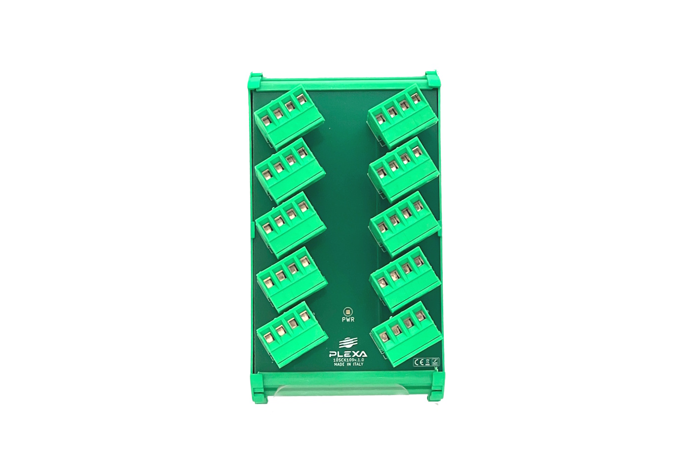 I 10 morsetti estraibili del modulo, sono collegati in parallelo tra loro e consentono un cablaggio più ordinato dell'impianto e semplificano le fasi di manutenzione dell'impianto consentendo di staccare e isolare facilmente una parte di impianto.